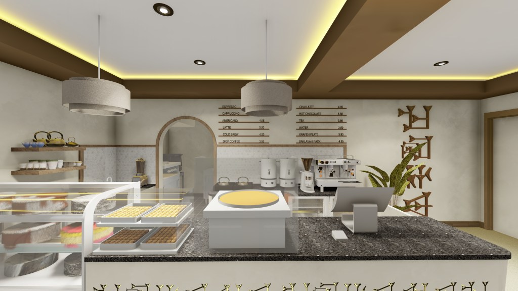 Working with a tight budget, our design for Marhaba Coffee Shop brings a sleek feel to a Middle Eastern cafe, taking cues from our client’s vision, we embedded Sumerian motifs as standout elements in reference to the client’s origins. Anticipated completion by Q2 of 2025.