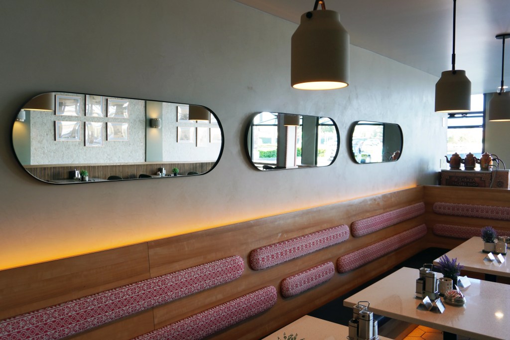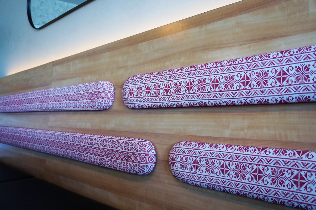 This custom booth celebrates Palestinian culture by incorporating traditional embroidery patterns as a central motif. The intricate designs pay homage to the rich heritage of Palestinian craftsmanship, blending cultural storytelling with modern design. Thoughtfully crafted, the booth serves as a striking and meaningful tribute to tradition at Sababa Falafel Shop.